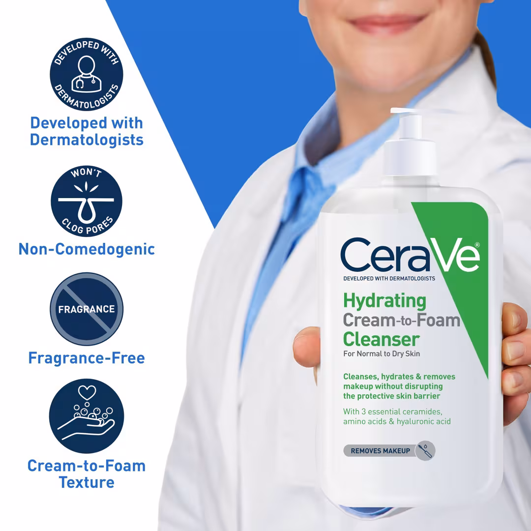 CeraVe Hydrating Cream-to-Foam Cleanser is a dermatologist-developed daily cleanser that transforms from creamy texture to a soft foam to effectively cleanse while keeping your skin’s protective barrier intact. Formulated with three essential ceramides, hyaluronic acid, and niacinamide, this gentle cleanser removes dirt, oil, makeup, and impurities without stripping away moisture.