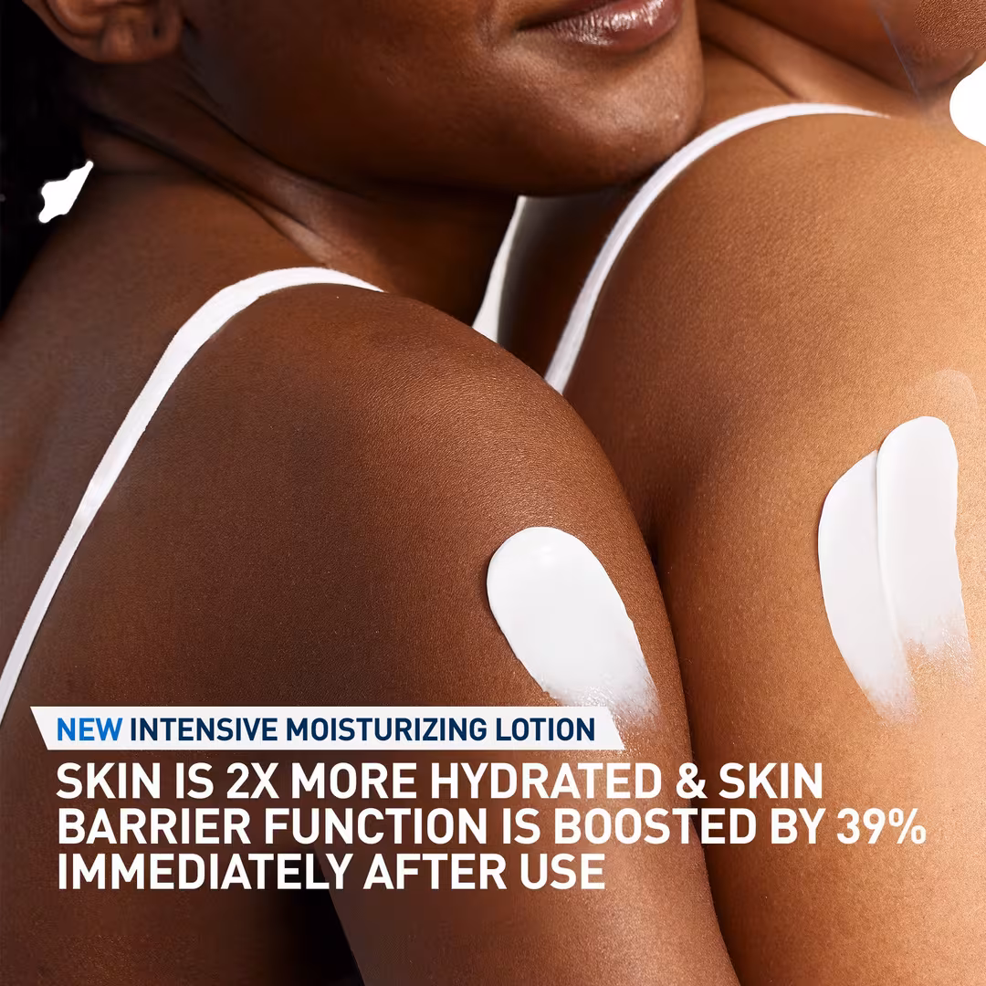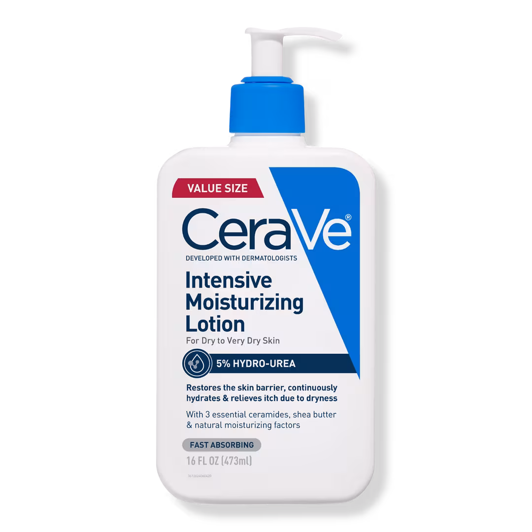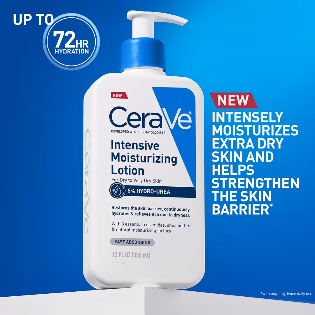 CeraVe Intensive Moisturizing Lotion is a dermatologist-developed body lotion designed to provide deep, long-lasting hydration for dry to very dry skin. Its advanced formula features a blend of three essential ceramides, hyaluronic acid, and 5% Hydro-Urea to help replenish the skin’s natural moisture factors and lock in hydration while reinforcing the skin’s protective barrier.