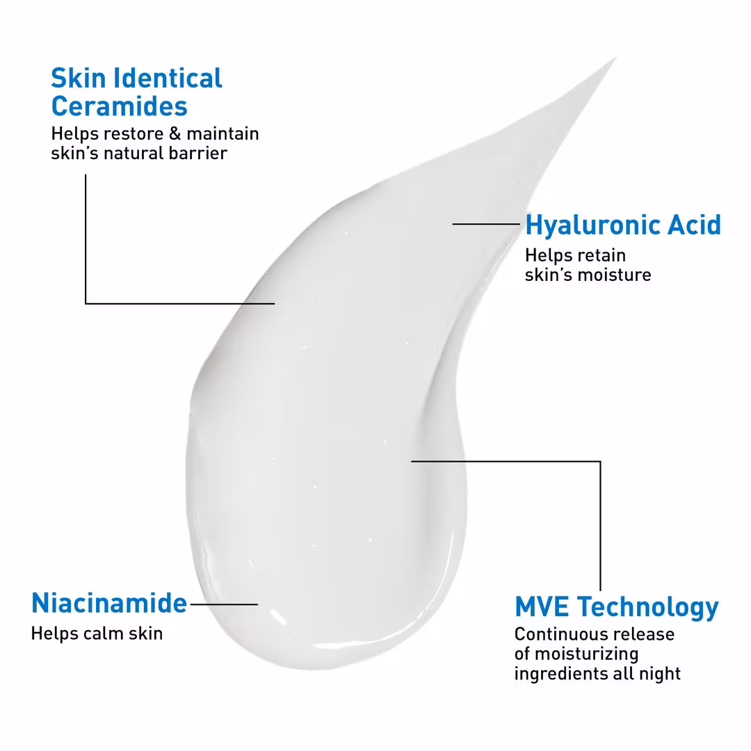 CeraVe PM Facial Moisturizing Lotion is a dermatologist-developed night moisturizer designed to hydrate, soothe, and help restore your skin’s natural protective barrier overnight. Formulated with three essential ceramides, niacinamide, and hyaluronic acid, this ultra-lightweight, oil-free lotion delivers continuous hydration using patented MVE® Technology to release moisture throughout the night. Its gentle, non-comedogenic, and fragrance-free formula makes it suitable for all skin types, including normal, combination, and sensitive skin.