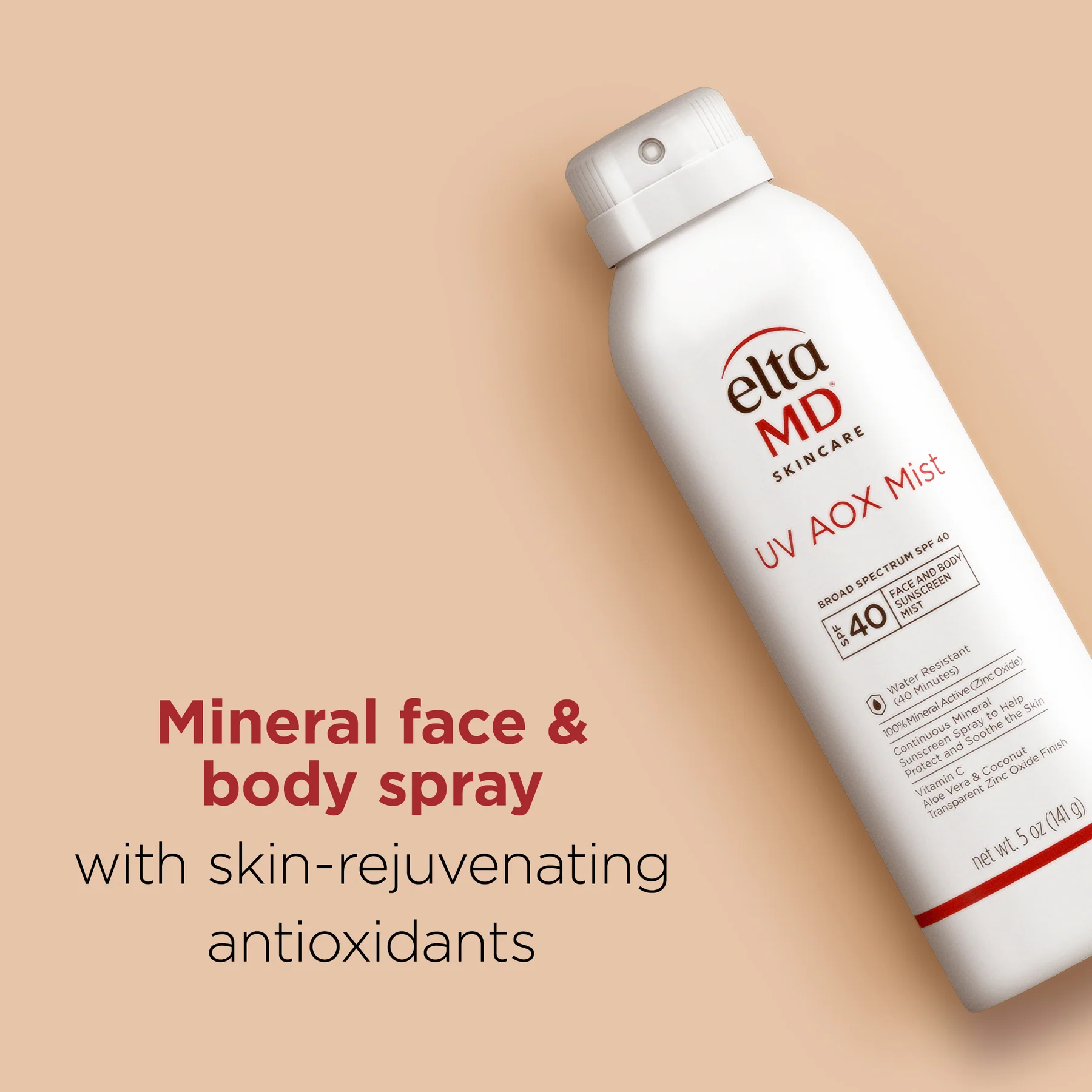 EltaMD UV AOX Mist Broad-Spectrum SPF 40 is a mineral sunscreen spray that combines reliable sun protection with antioxidant support in a fast-absorbing, easy-to-use mist. Formulated with 14% zinc oxide, this SPF mist shields your skin from UVA and UVB rays while delivering antioxidant benefits from vitamins C and E to help defend against environmental stressors. Gentle ingredients like aloe, coconut fruit extract, and glycerin help keep skin hydrated and comfortable.