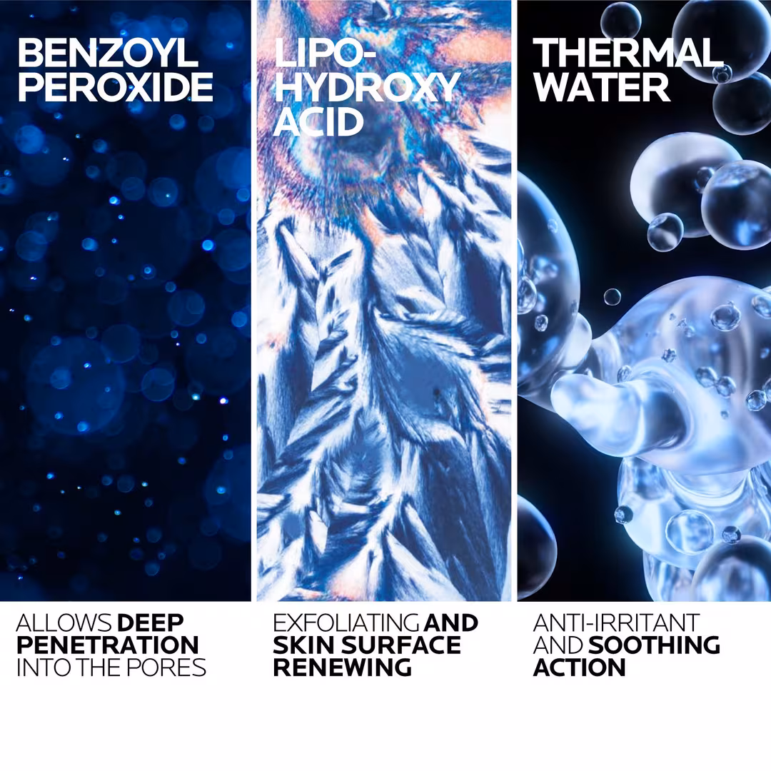 La Roche Posay Effaclar Acne Face Wash with 4% Benzoyl Peroxide is a dermatologist developed cleanser designed to treat and help prevent acne breakouts. The formula contains 4 percent benzoyl peroxide to effectively target acne causing bacteria, reduce blemishes, and help keep pores clear.