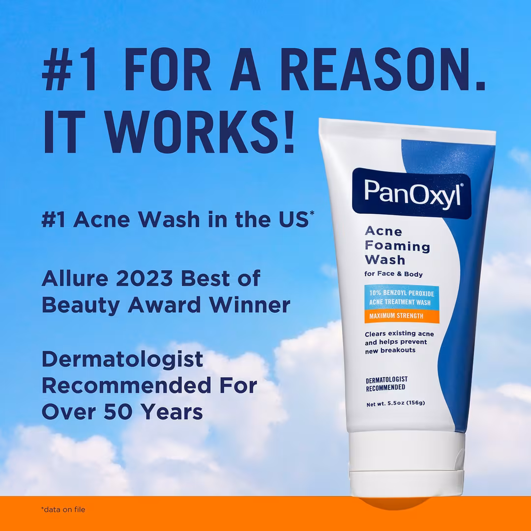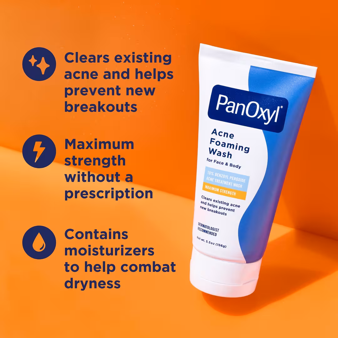 PanOxyl Acne Foaming Wash is a maximum‑strength acne treatment cleanser formulated with 10% benzoyl peroxide — the highest concentration available without a prescription. This powerful foaming wash helps kill acne‑causing bacteria, deeply cleanse and unclog pores, and clear existing blemishes while helping prevent new breakouts from forming. Its dermatologist‑recommended formula is suitable for use on the face, chest, and back.