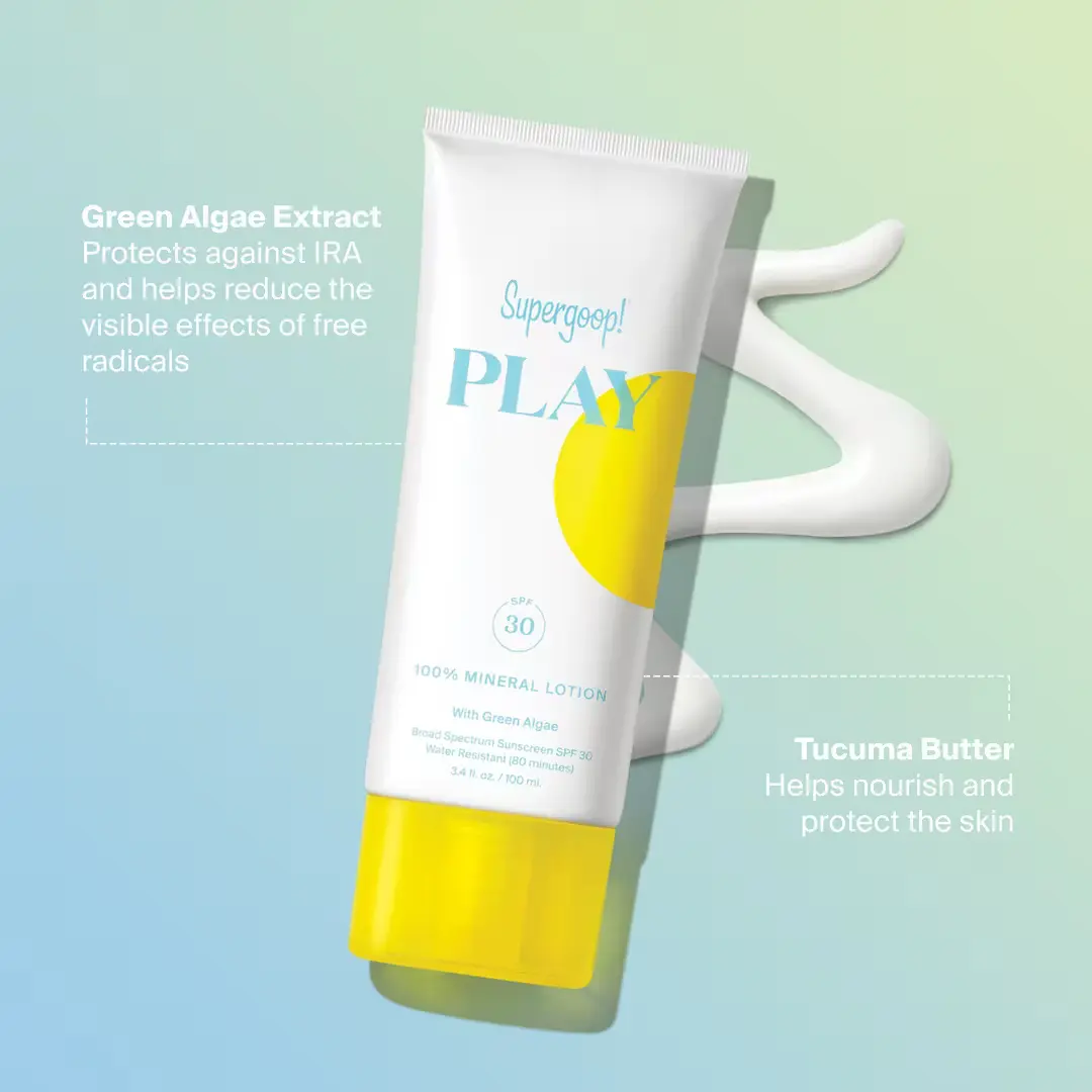 Supergoop! PLAY Mineral Lotion SPF 30 with Green Algae is a gentle, broad-spectrum mineral sunscreen lotion designed for everyday sun defense on both face and body. Formulated with zinc oxide and titanium dioxide, it provides effective SPF 30 protection while feeling lightweight, fast-absorbing, and non-irritating — even on sensitive skin.