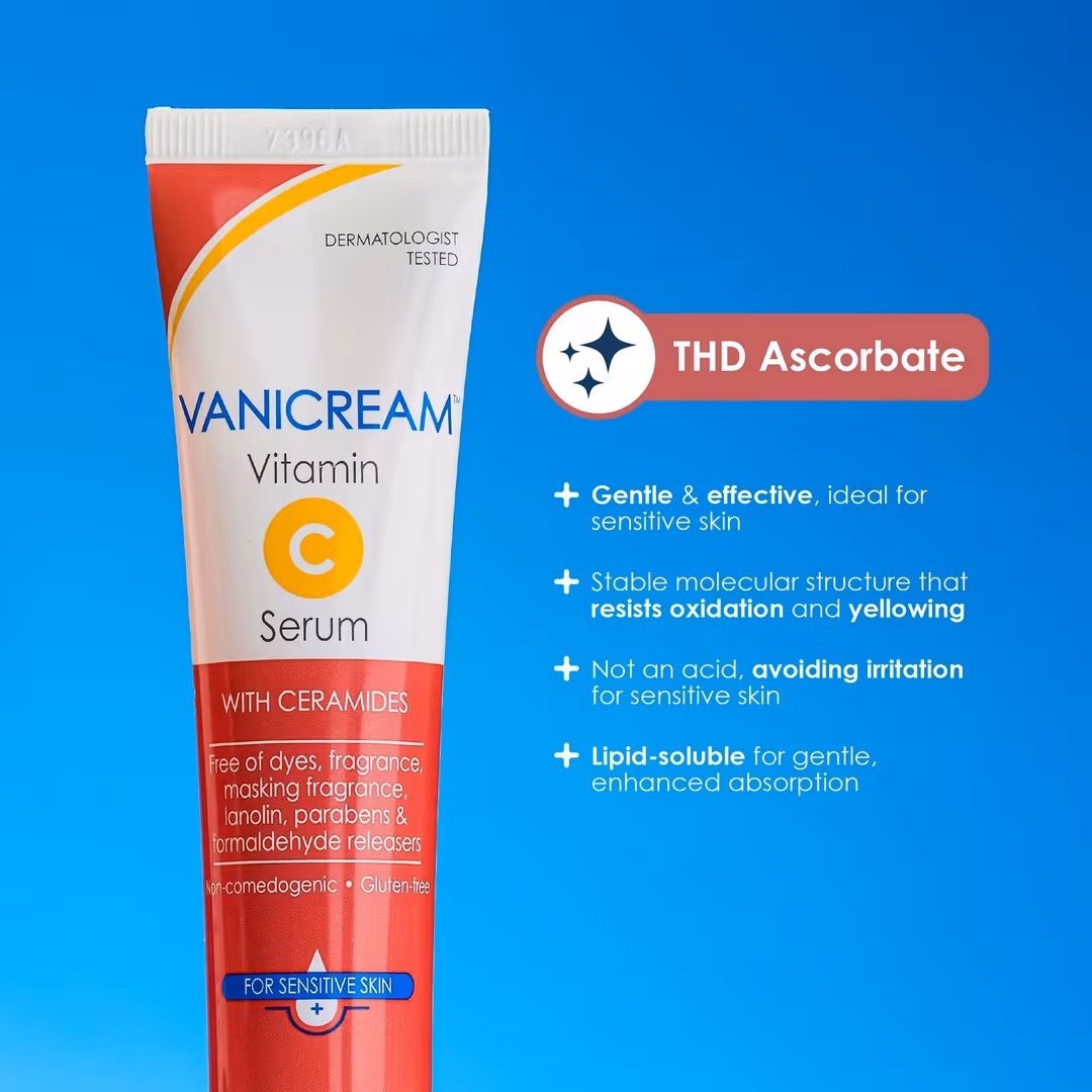 Vanicream Vitamin C Serum is a lightweight, dermatologist-tested serum formulated specifically for sensitive and uneven skin. Using a potent yet gentle vitamin C derivative (tetrahexyldecyl ascorbate), it helps enhance skin brightness, improve the appearance of dullness, and promote an even, radiant complexion without irritation. The milky, fast-absorbing texture layers easily under moisturizers, sunscreens, or makeup and is non-greasy and non-comedogenic.